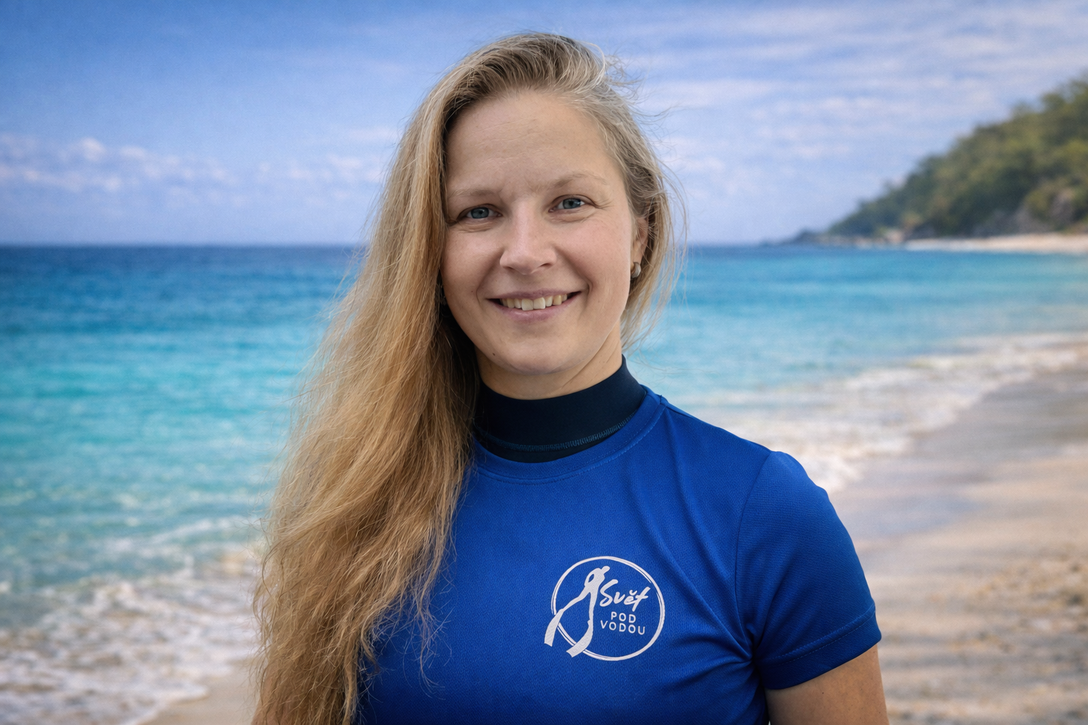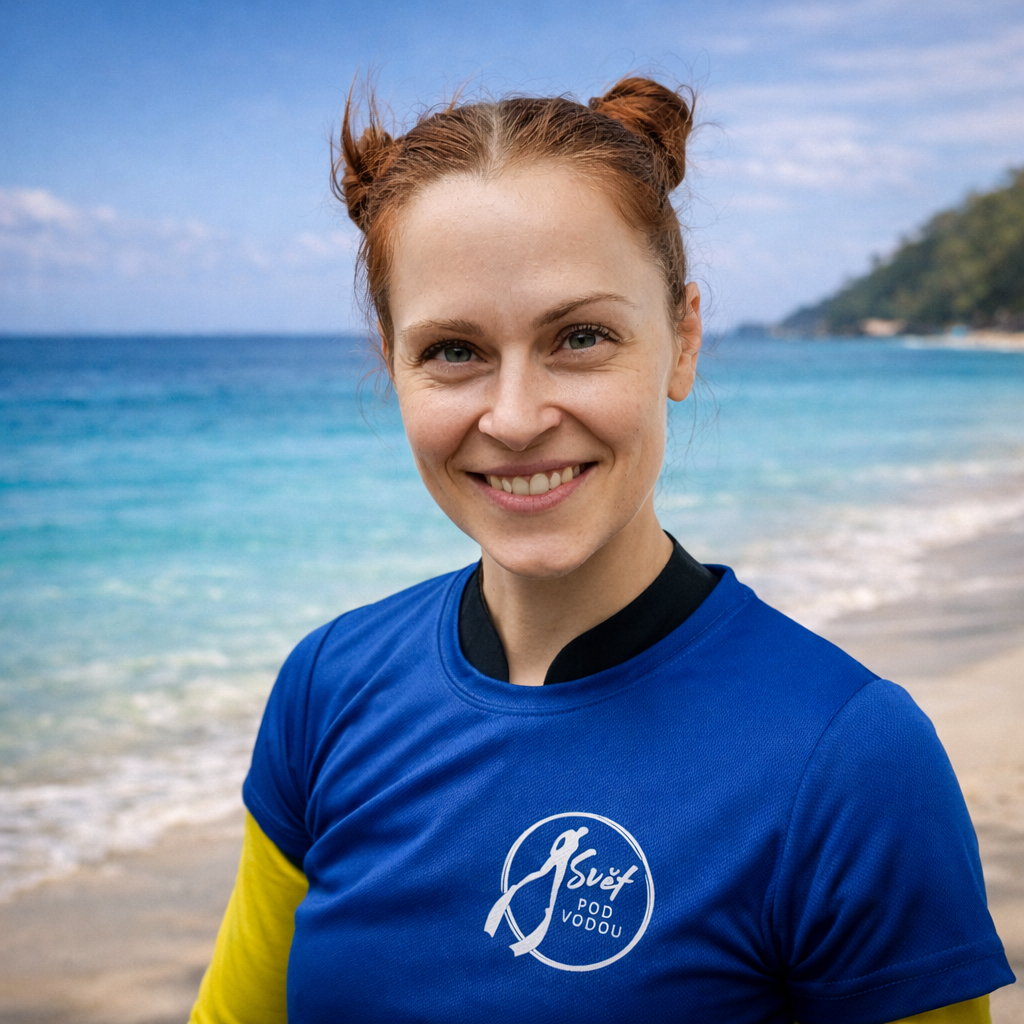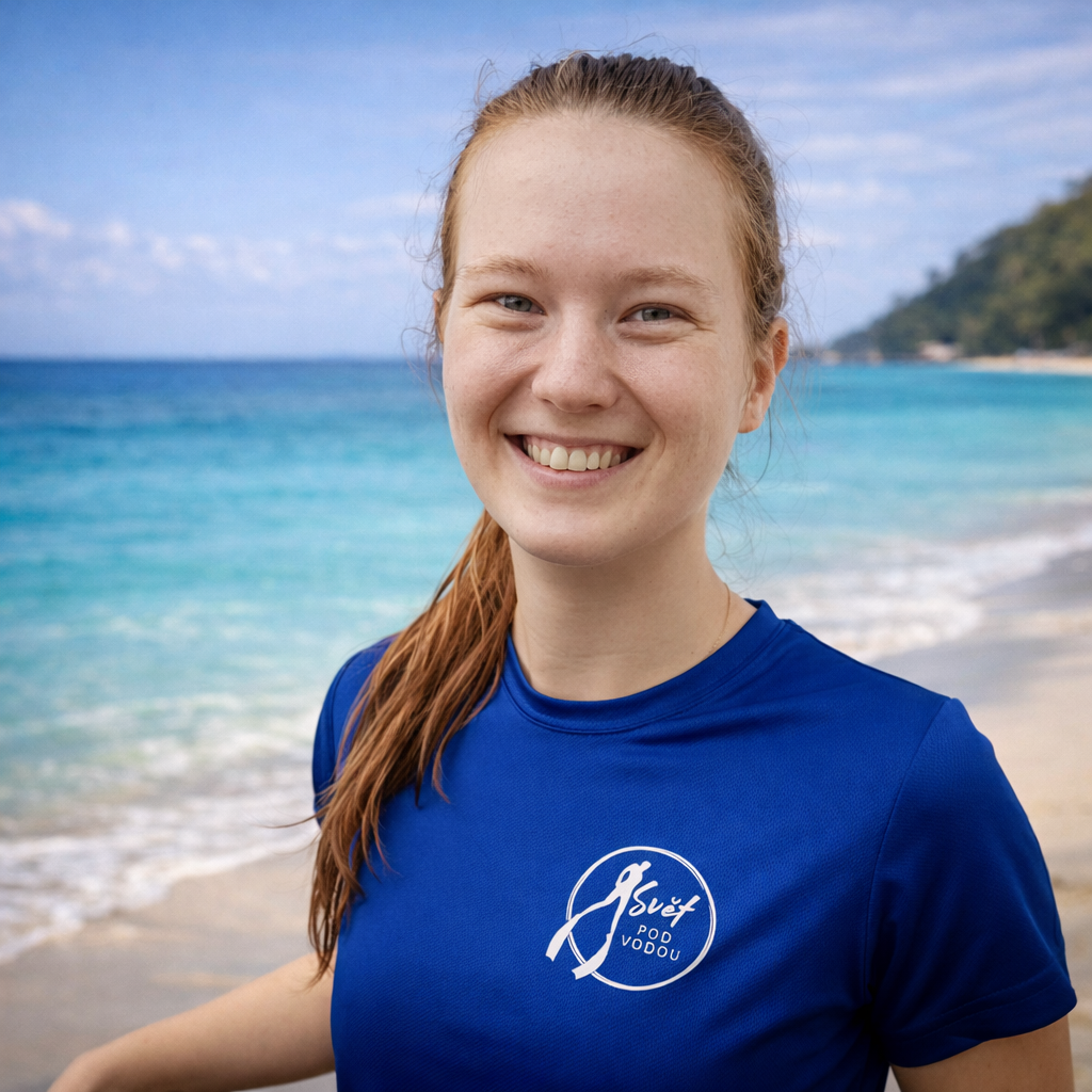 Už od dětství měla ráda vodu, ale když se dno ztrácelo pod nohama v hlubinách, přicházela panika. Pomohlo nasazení plaveckých brýlí a zjištění, co se vlastně ve vodě skrývá. V létě roku 2021 na dovolené s delfíny vyzkoušela poprvé freediving, aniž by věděla, že něco takového v tu chvíli dělá, nebýt člena posádky, který v ní viděl skrytý talent. A tak s novým zájmem po návratu do Čech se začala rozhlížet po nějakém tom potápění. Osud jí přihrál do cesty potápění jako volitelný předmět při studiích na vysoké škole. Jednalo se sice o přístrojové potápění, ale to jí od tohoto předmětu neodradilo a udělala si tak rovnou OWD kurz. Ovšem původní zájem byl o freedivng, a tak se nechala instruktorem přístrojového potápění seznámit s někým, kdo vyučuje freediving. Ten někdo byl Mick. S Mickem jela na katamarán do Řecka, kde si udělala kurz Freediver Level 1. Postupně začala chodit na tréninky, jela se potápět do Trhovky, pak do Dahabu, kde si udělala Level 2, a taky do Deepspotu a už to jede jak na běžícím páse. Díky zkušenosti na katamaránu ji o to víc chytly i lodě, které vždy milovala, a udělala si tak kapitánské zkoušky. Nakonec zjistila, že se pohybuje na akcích Světa pod vodou a začala tak se Světem pod vodu spolupracovat. Momentálně je hlavně v zákulisí a má na starosti především administrativní stránku školy. Občas na ní můžete narazit na nějakých akcích, kurzech, nebo s ní mluvíte po telefonu. A v létě jí nejdete za kormidlem katamaránu v Řecku, kde její cesta do Světa pod vodou vlastně začala.
